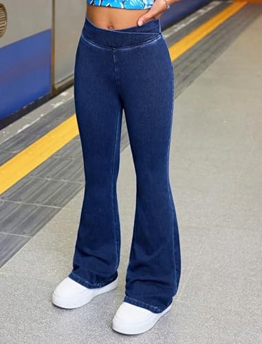 Girls Stretch Flare Jeans 8-12Y Crossover Waist Denim Pants Exercise Basics Slim Casual Streetwear 6