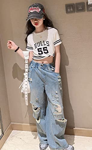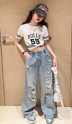 Girls Wide Leg Ripped Jeans Kids Baggy Elastic Waist Washed Denim Pants 5-14 Years 6