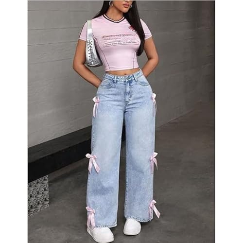 More information about Baggy Jeans for Women Teen Girls Bow Cute Denim Jeans High Waisted Straight Leg Pants Aesthetic Scene Clothes