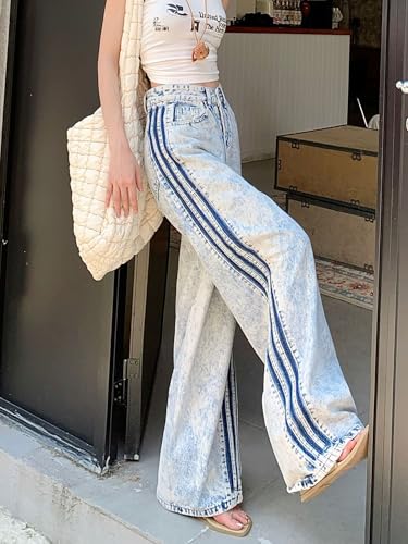 More information about Women's Stretchy Side Striped Wide Leg Jeans High Waisted Straight Leg Y2K Cute 90s Baggy Boyfriend Jeans for Teen Girls