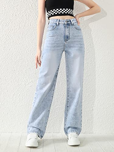 SweatyRocks Girl's Casual High Waist Solid Denim Pants Stretchy Flare Leg Jeans with Pocket Light Blue 8-9Y 2