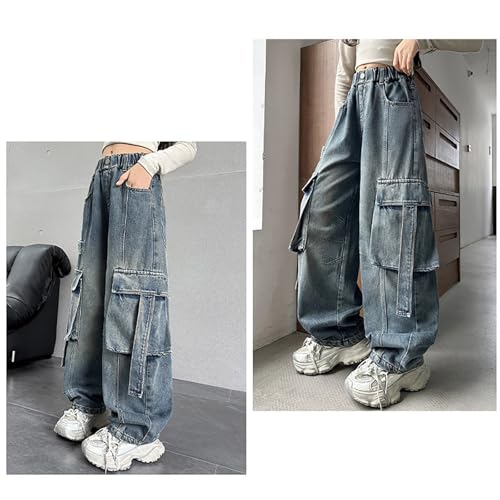 HOT ! Girls Cargo Jeans Baggy Wide Leg Streetwear Denim Pants Teen Kids Retro Loose Fit Jeans Multi Pockets High Waist Pants