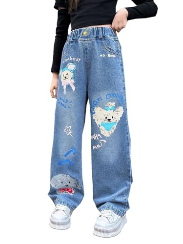 Girls Cute Cartoon Dog Print Jeans Elastic Waist Long Denim Pants Straight Pants Kids Jeans Trousers 6