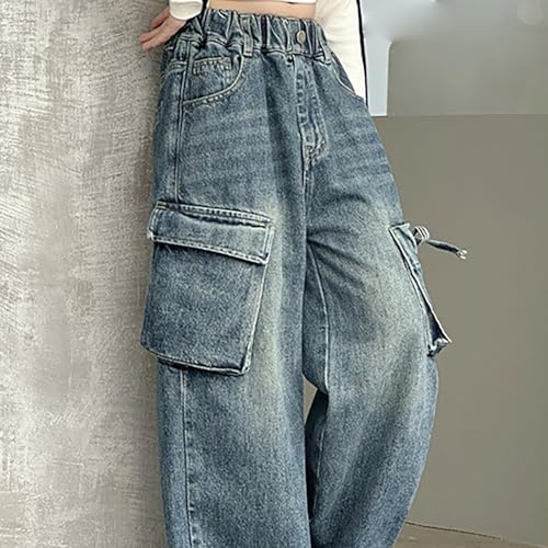 Cargo Pants for Girls Baggy Wide Leg Jeans Teen Washed Denim Pants High Elastic Waistband Straight with Pockets 6