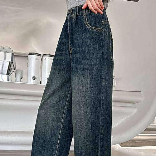 HOT ! Teen Girls Baggy Straight Jeans Elastic High Waist Wide Leg Tassel Trim Denim Pants Kids Girls Stylish Stretchy Trousers