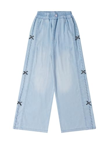 Hansber Girls Wide-Leg Denim Jeans Elastic Waistband Y2k Pants with Pockets School Casual Bowknots Pants 7