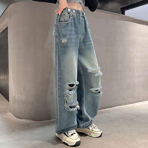 HOT ! Wide Leg Ripped Jeans for Girls Baggy Elastic High Waist Hole Y2K Denim Pants Streetwear Straight Kids Fall Bottom