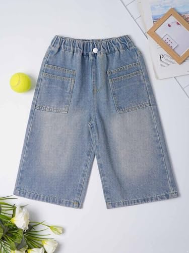 More information about Kids Girls Pull On Cropped Denim Pants High Waist Straight Wide Leg Jeans Trousers with Patch Pockets