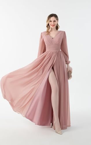 Long Sleeve Chiffon Bridesmaid Dresses for Women V-Neck Wedding Guest Dress Formal Evening Gown with Slit 4