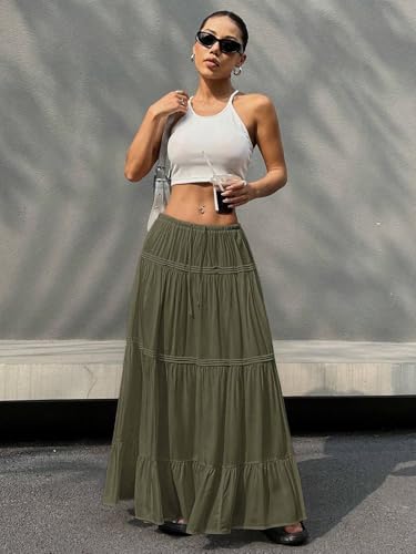 Women's Summer Solid Color Tie-Waist Ruffle Hem Long Casual Skirt Going Out Outfits 6