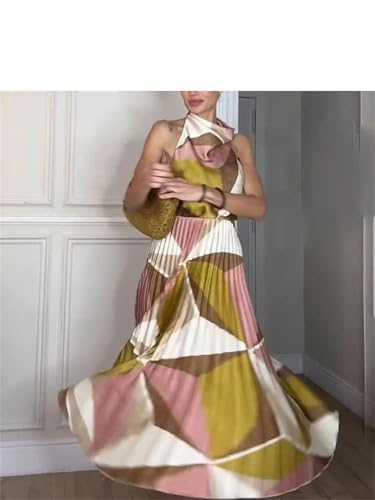 Women Pattern Suit Backless Sleeveless Hanging Neck Collar Top+Waist Printed Pleated Midi Skirt 6