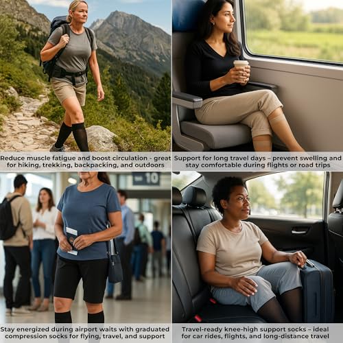 • GRADUATED COMPRESSION – Knee-high and snug by design, these socks deliver firm 20–30 mmHg pressure that may feel tight—this is normal and essential for boosting circulation, reducing swelling, and supporting varicose vein relief.