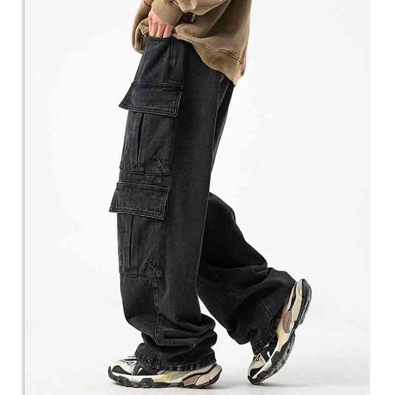 HOT ! Men's Multi Pocket Design Jeans Vintage Washed and Worn Cargo Pants Loose Casual Wide Leg Pants