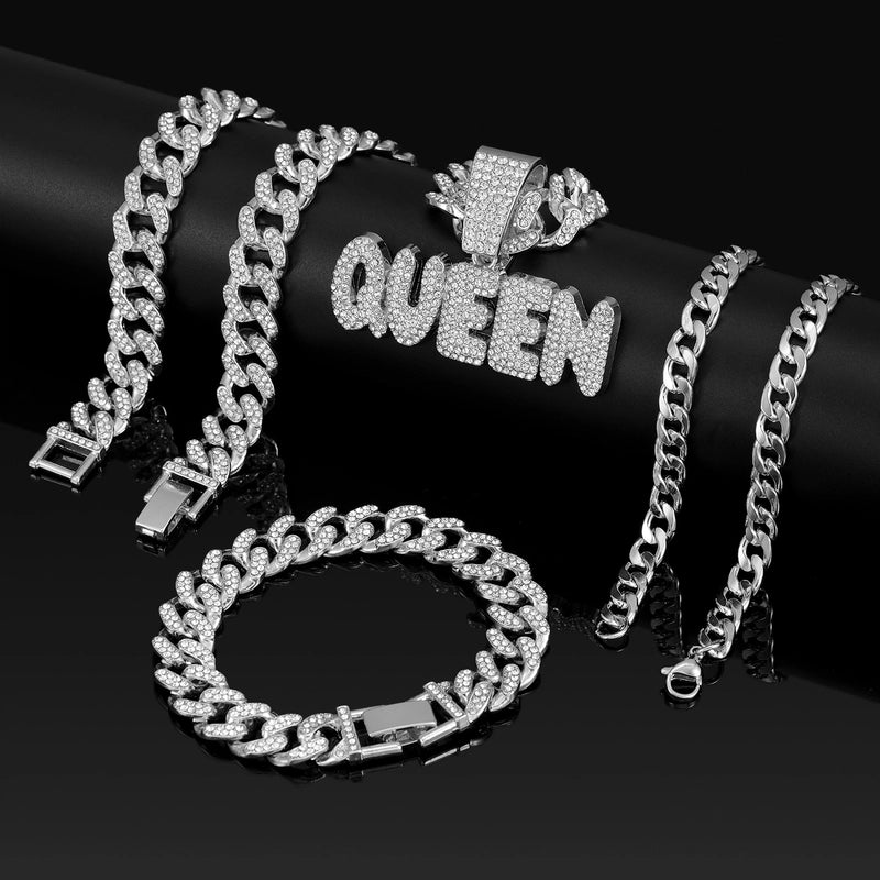 Style Jewelry Three-Piece Queen Pendant Alloy Full Diamond Cuban Link Chain Bracelet NK Chain 4