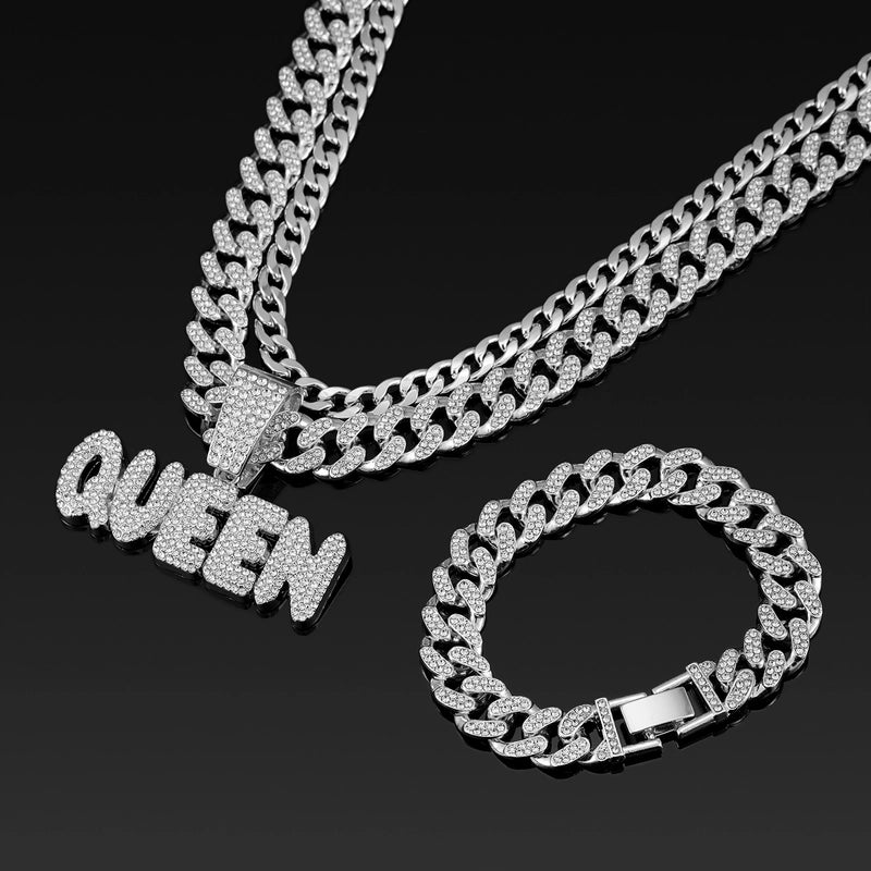 HOT ! Style Jewelry Three-Piece Queen Pendant Alloy Full Diamond Cuban Link Chain Bracelet NK Chain