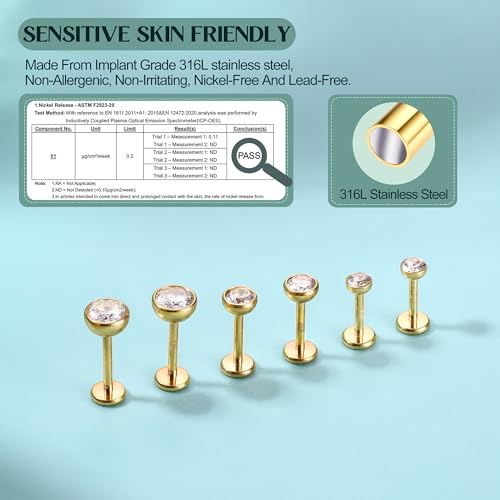 • Details of Dainty Flat Back Earrings Studs Set : These flat back stud earrings are made of 316L stainless steel, includes 3 pairs posts (bar Length: 6mm 7mm 8mm), 3 pairs different size of thread top(top size: 3mm 4mm 5mm), 1 pc piercing taper insertion pin, and post thickness: 18G (1mm)