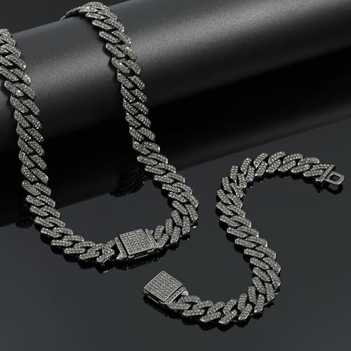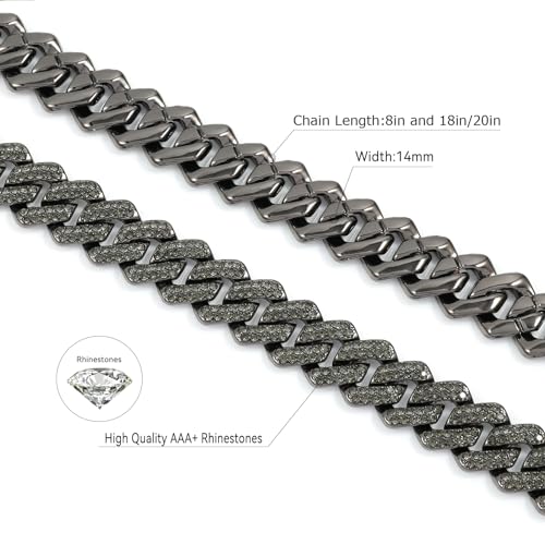 • 【HEAVY & STRONG CHAIN】- 2 Pieces Cuban Necklace and Bracelet is a solid chain.The cuban link chain for men and women is 14mm in width.High Quality AAA+ Rhinestones Reveals Brilliant Shine.