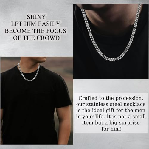 • Quality & Craftsmanship: The exquisite Cuban link chain necklace is finely polished to achieve a smooth and delicate finish. Durable stainless steel ensures that the son necklace remains rust-resistant, fade-resistant, and hypoallergenic, making it suitable for daily wear. This men's necklace features an upgraded reinforced and enlarged lobster clasp, allowing him to wear it easily without worrying about the chain falling off and ensuring the silver chain stays in place