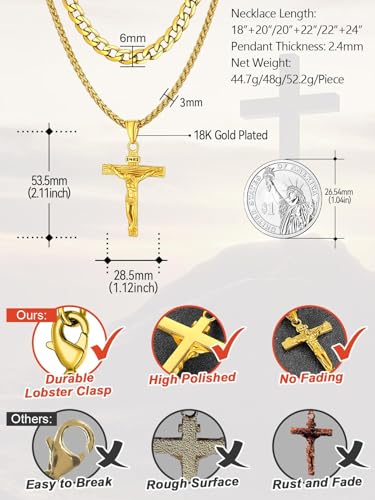 • Gold Crucifix Necklace: The gold cross necklace set includes an 18" length, 6mm width Cuban chain and a 20" length, 3mm width wheat chain with a crucifix cross pendant