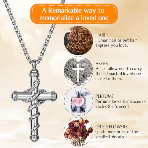 • 【Snake Cross Design Urn Necklace】The unique snake-shaped winding cross design symbolizes eternity, protection and rebirth, combining religious beliefs and artistic elements, which is both commemorative and fashionable. Combining snakes, crosses and ashes keepsakes, it expresses that although our loved ones have passed away, they will always live in our hearts.