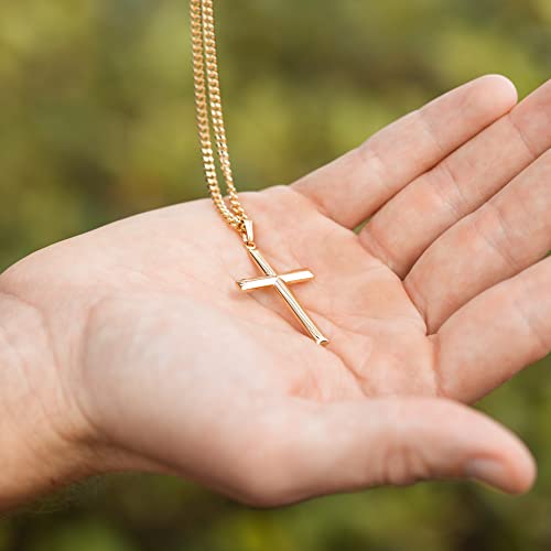 Men's Gold Filled Christian/Catholic Large Cross Pendant Necklace, Masculine & Big Gold-Filled Cross Shaped Pendant, 24" (Inch) Stainless Steel Curb Chain Necklace With Spring Ring Clasp, Male Cross 1