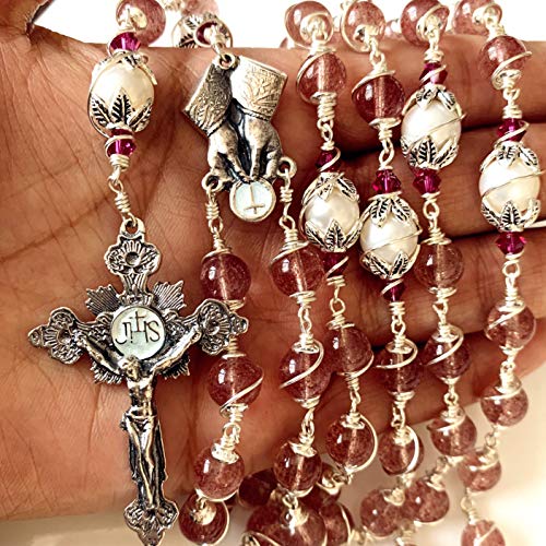 elegantmedical HANDMADE UNDOUBTED STRAWBERRY BEADS & REAL AAA10MM PEARL STERLING 925 SILVER ROSARY NECKLACE CRUCIFX & BOX CATHOLIC GIFTS 1