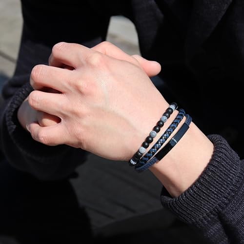 • ✦ PREMIUM HANDCRAFTED MEN’S BRACELET ✦ Each bracelet is expertly handmade with genuine braided leather, natural Blue Agate and Black Obsidian gemstone beads, and durable 316L stainless steel. Finished with scratch-resistant IP plating, it combines rugged durability with a sophisticated matte look, a stylish essential for every man.