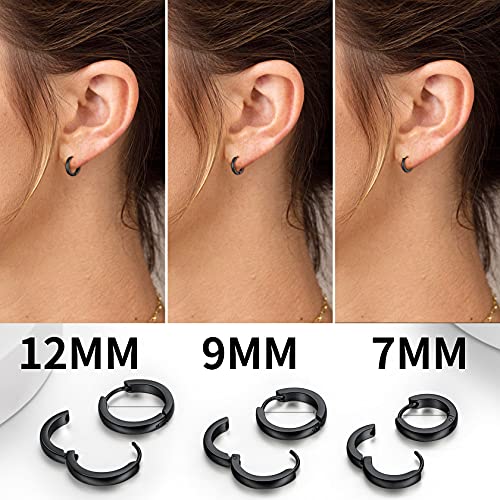 ChainsHouse Hypoallergenic Surgical Stainless Steel Hoop Earrings Set, 18K Gold/Black Metal Plated 7mm/8mm/9mm/12mm 3 Pairs Nickel Free Huggie Hoop Earrings for Women Men, with Gift Box 6