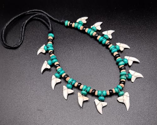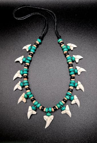 • This shark teeth necklace features 13 awesome genuine mako shark teeth held by attractive green color wooden beads on waxed cords. The length of the necklace is adjustable for your perfect fit from 16 to 32 inch by sliding the slip knots of the waxed cords. A cool looking Ocean-Inspired beach surfer Shark Tooth Necklace for Men Women.