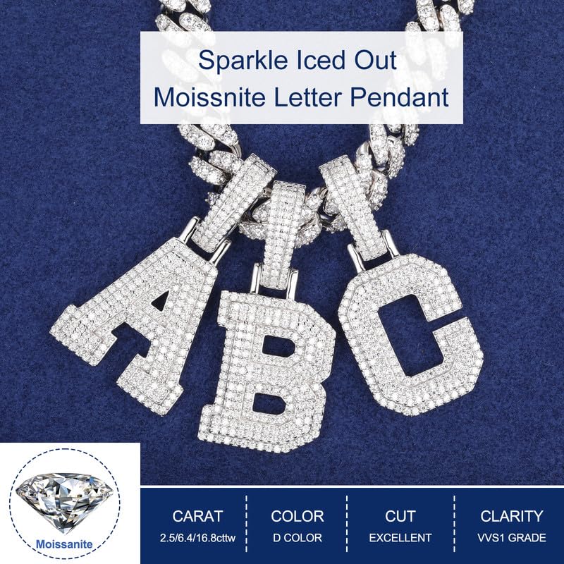 • 【Top Class Moissanite Letter Pendant】 Iced Out A Letters Alphabet Necklace pendant, Hip Hop Style, Bling Moissanite Diamonds, S925 Sterling Silver Material, Attractive and Eye-catching. The details of This impeccable piece with skilled craftsmanship and gorgeous color, present you with the unique feeling.If you want it have luminous effect, you can also contact us for details.