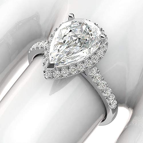 • This solid Sterling Silver Pear-Shaped halo engagement ring is highly polished. The entire halo is 10mm x 14mm (0.40inches x 0.55inches). It is 3-claws set with one simulated 8mm x 12mm(0.32inches x 0.47inches) Pear-Shaped clear diamond. The band shank measures 2mm in width. There are 35 stones in total set in halo and shoulders. The stone is AAAAA quality, reflecting the sparkle same as diamonds do, which is very nice and attractive, making the ring look like real diamond ring.