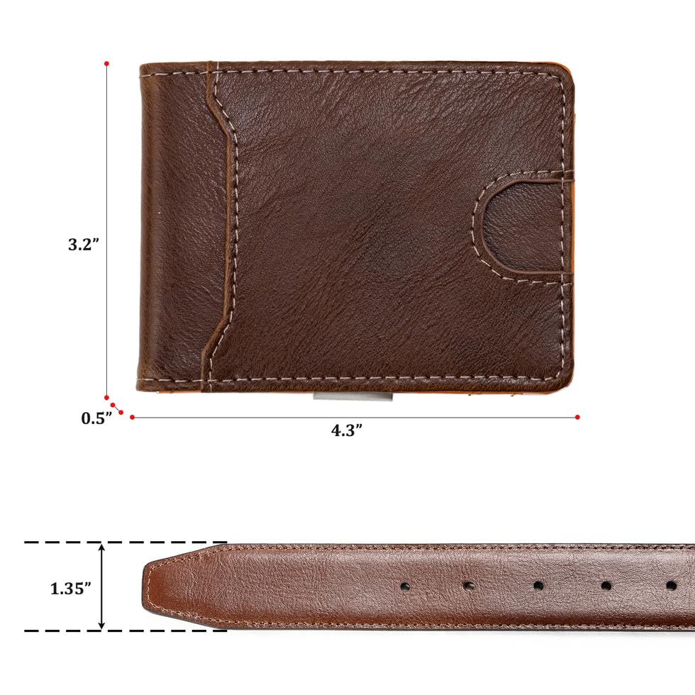 • Size: The leather belt for men is 1.35" wide. The removable buckle makes it easy to trim the belt to your desired size. One size (44 inches) fits waists from 30 to 42 inches. And the measurement of leather wallet is 4.3" x 3.2" x 0.5"