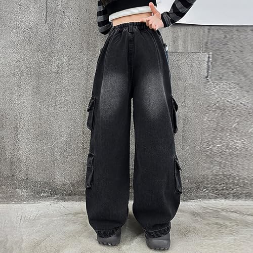Girls Streetwear Denim Cargo Pants Elastic Waist Floor Length Baggy Wide Leg Jeans Washed Vintage Trousers Multi Pockets 7