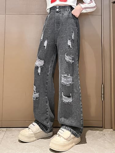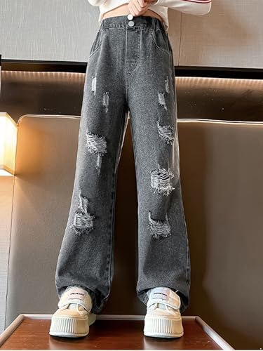 Kids Girls Elastic Waist Cool Ripped Jeans Washed Denim Wide Leg Ripped Denim Jean 6