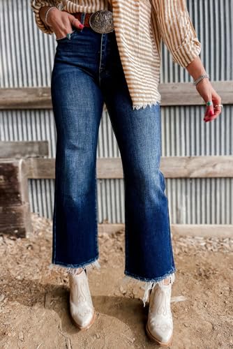 HOT ! Women's High Waist Mineral Wash Raw Hem Flared Jeans - Sail Blue