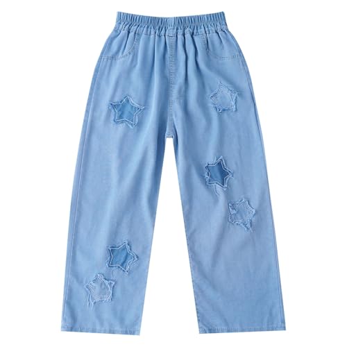 JanJean Girls Vintage Star Printed Straight Jeans Wide-Leg Denim Pants Ripped Baggy Trousers for Kids 6