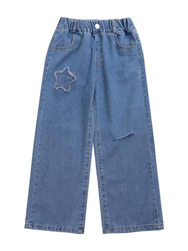 easyforever Kids Girls Wide Leg Denim Pants Star Patch Ripped Jeans Elastic Waist Casual Distressed Denim Trousers 6