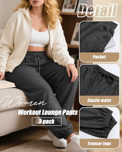 3 Pack Women's Plus Size Sweatpants, Drawstring Loose Fit Joggers Pants Comfy Casual Athletic Pants with Pockets 4