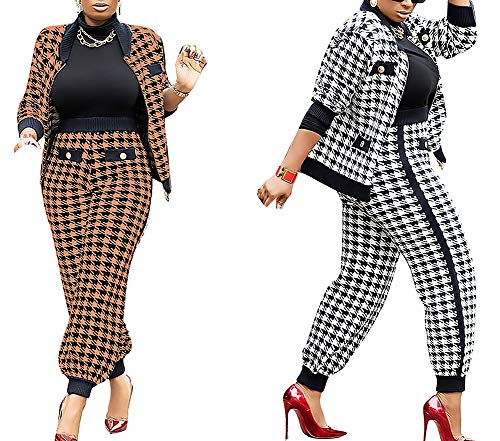 HOT ! LKOUS 2 Piece Work Suits for Women's Houndstooth Print Buttons Open Front Long Sleeve Coat + Long Pants Casual Clothes