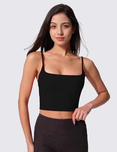 HOT ! Womens Scoop Neck Longline Sports Bra U Back Adjustable Strap Double Lined Workout Crop Tank Top with Built in Pads Black