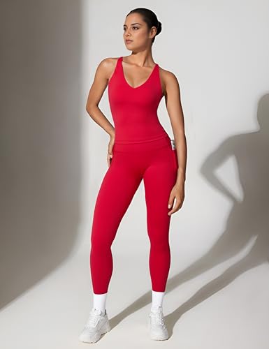HOT ! RXRXCOCO Strappy Back Workout Sets for Women 2 Piece Padded Tank Tops Hidden Scrunch Butt Lifting Leggings with Pockets