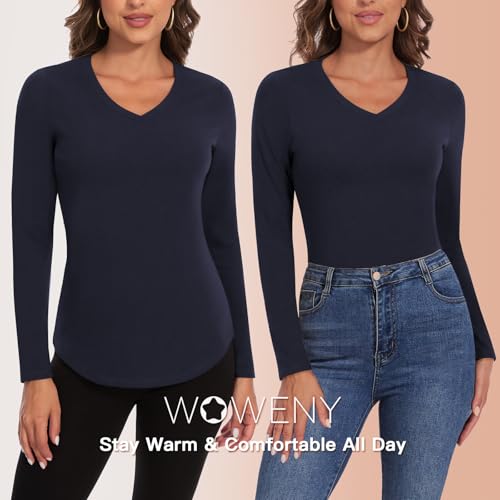 HOT ! WOWENY Thermal Shirts for Women V Neck Fleece Lined Long Sleeve Base Layer Soft Warm Underwear Tops Cold Weather