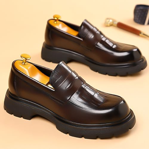 Men's Luxury Genuine Leather Platform Chunky Slip-on Penny Loafers Fashion Round Toe Lug Sole Patent Business Dress Shoes Classic Non-Slip Party Wedding Prom Work Shoes 7