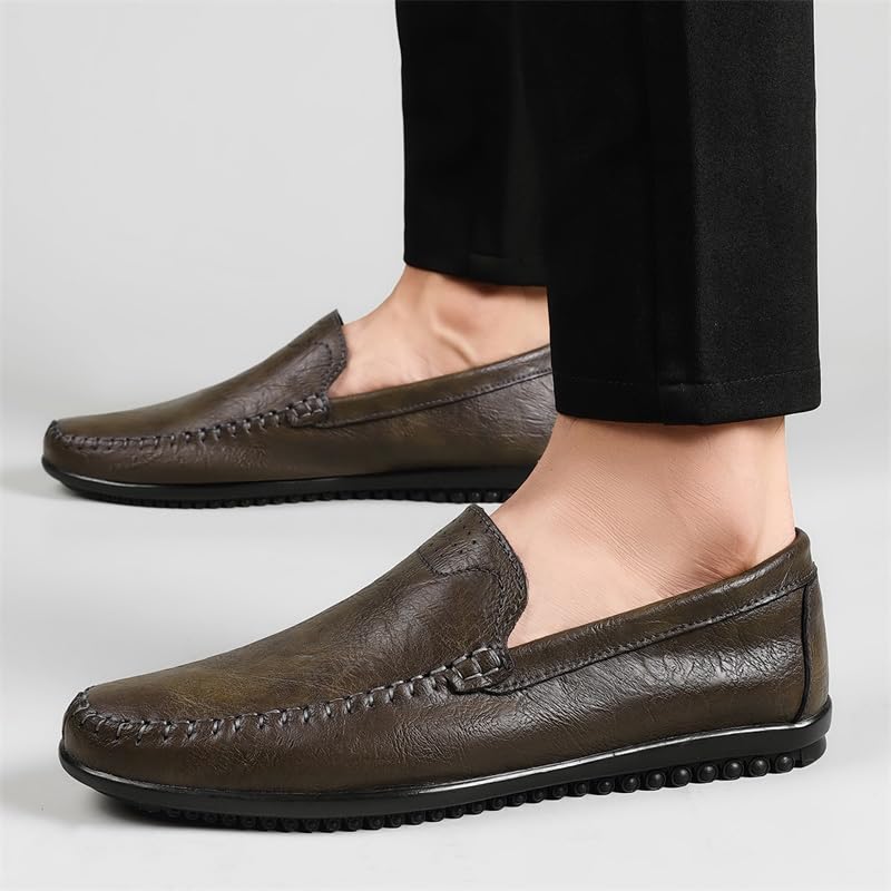 Mens Leather Slip-On Loafers Casual Shoes Soft Driving Moccasins Handmade Breathable Spring Summer Autumn Big Sizes Khaki & Black 6