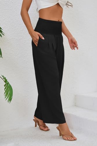 HOT ! Womens High Waisted Flowy Palazzo Pants Casual Loose Wide Leg Long Lounge Capri Pants Trousers with Pocket (Black,L)