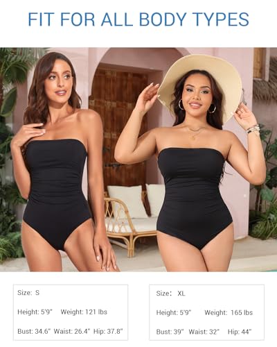 • The Strapless Bathing Suits for Women comes with a removable strap that provides two style options: a classic flattering halter one piece swimsuit or a bandeau swimsuit to meet your needs. The elastic band on the chest ensures that the bathing suits do not slip down when it is a bandeau swimsuit. The removable padded push up bra with side bones offers good support and shapes for your chest.