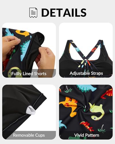 • Plus size swimsuit for women: This plus three-piece swimsuit includes a swim tank top, sports bra, and boyshort. The 3 piece swimsuit comes in a Black Dinosaur design and offers two ways to wear it: as a tankini swimsuit with a built-in padded bra or as a sports bra with boardshorts.