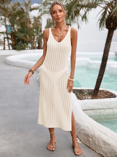 Womens Crochet Knit Sheer Beach Dresses Summer 2025 Backless V Neck Side Slit Bathing Suit Cover Up Midi Dress 4