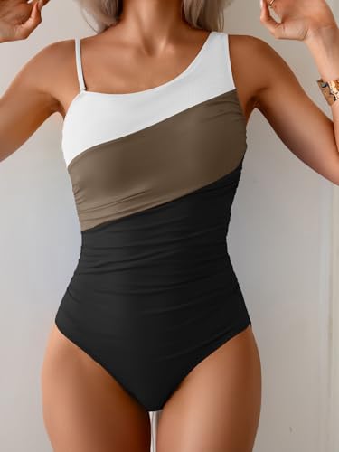 One Shoulder One Piece Swimsuit for Women Tummy Control Bathing Suits Color Block Ruched Swim Suit Slimming Swimwear 1