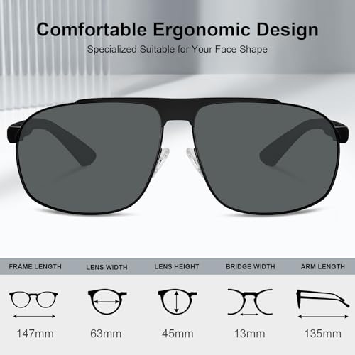 • Mens Sunglasses Polarized UV Protection - Our black mens polarized sunglasses effectively block 100% harmful UVA/UVB rays up to 400nm. Protect eyes from squinting/fatigue/wrinkles. Our HD lens also offer unprecedented control of light transmission, resulting in colors precisely tuned to maximize contrast & enhanced visibility. Means eliminate 99% harsh glare while visibility is clear. Really large curved lens offer much more coverage & protectiong against UV rays/sidelights/glares/wind/dust.